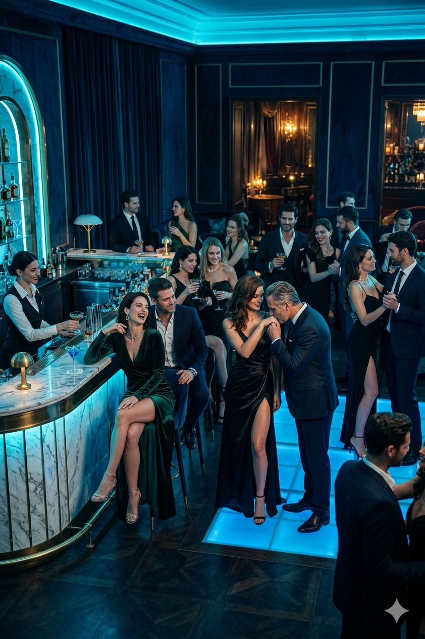 Le coppie si muovono tra gli ambienti dedicati mentre gli uomini selezionati si avvicinano con discrezione, con quella galanteria che rende tutto più affascinante.