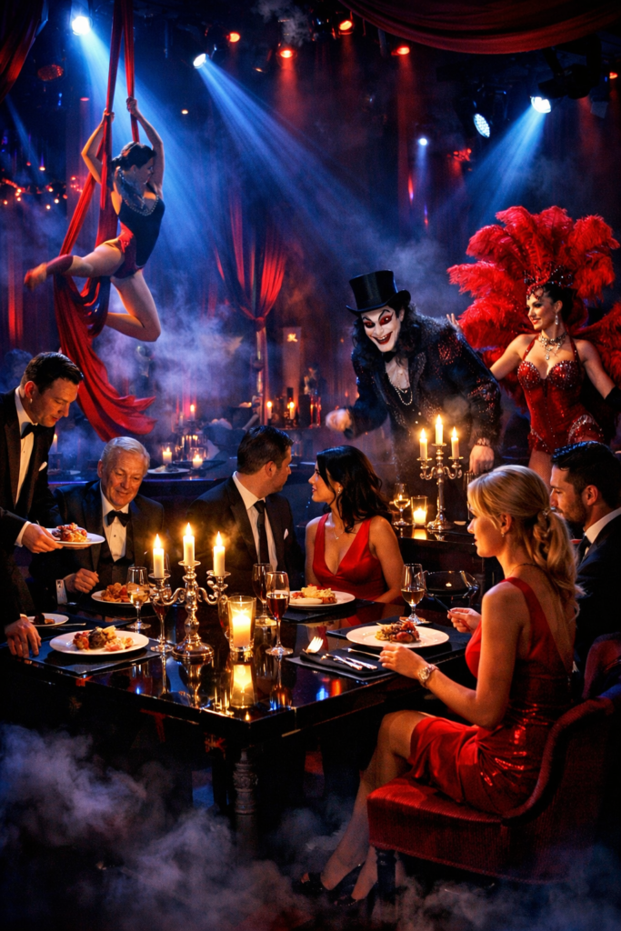 Dalle 22.30 in poi, la cena lascia spazio alla notte: il club si trasforma in un circo oscuro ed elegante, dove spettacolo, musica e libertà si fondono in un’unica esperienza.